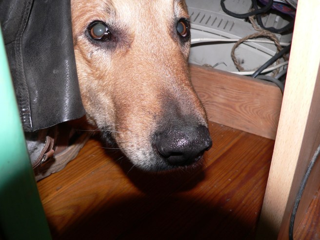 Um halb neun finde ich zurück ins Leben. Häschenstellung, ausgewachsener Kater. Über dem Hinterkopf dräut das Tischgestell. Vor meiner Nase ein interessiert geöffnetes Hundeauge.